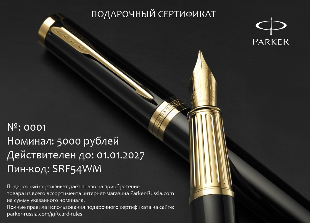 Подарочный сертификат Parker 7000 от официального дилера Parker в Петрозаводске. Вы можете дополнительно заказать гравировку, которая подчеркнет Вашу оригинальность и придаст памятность статусному подарку. Все ручки Паркер поставляются в фирменном футляре.